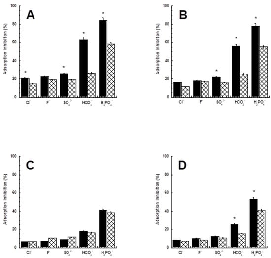 Inhibition (%) of As(III) (black bars) and As(V) (checkered bars) adsorption by competing inorganic anions from Zn-Al (A), Mg-Al (B), Cu-Al (C) and Mg-Fe (D) layered double hydroxides, after 24 h of reaction at pH = 7 and 20 °C. Initial anion/As(V) ratio equals to 3, with 50% of surface coverage. Asterisks indicate significant differences according to one-way ANOVA, HSD Tukey test (p < 0.05).