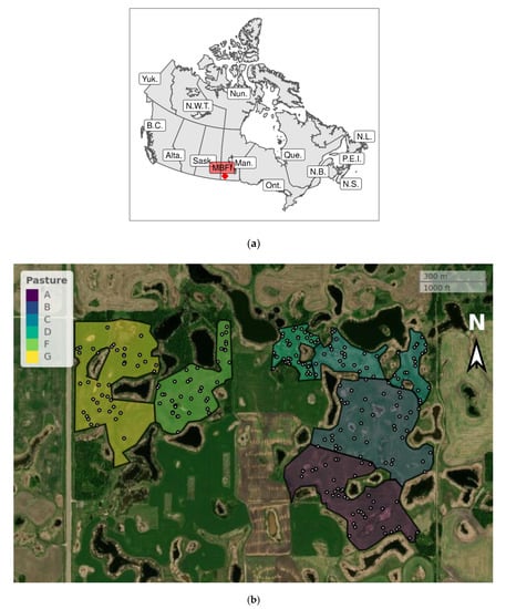 (a) Regional context and (b) Pastures A–G at the field site. For (a), the site location is marked as Manitoba Beef and Forage Initiatives (MBFI) within Manitoba (Man.), with abbreviations given for other provinces and territories in Canada. For (b), dark areas are prairie potholes with permanent water. Each sample point is indicated as a white circle with a dark ring. North is shown as the arrow to N. Scale is shown to the uppermost right.