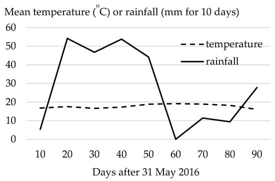Mean temperature and cumulative rainfall for 10-day intervals from 1 June to 29 August 2016.
