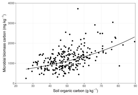 Data on soil biota is limited markedly compared to aboveground systems, and to build our understanding of functional relationships will require more information about soil organisms and their effects on ecosystem services [1]. Microbial biomass carbon (MBC) can be determined by measuring the flush of carbon released from soil, in response to chloroform fumigation, and it corresponds to the entirety of microorganisms therein [2]. Soil microbial biomass can immobilize and mineralize nutrients [3,4]. Although MBC corresponds to only 1–3% [5] of soil organic carbon (SOC), microbes play a central role in aggregate formation during soil structural development [6]. Specifically, microaggregates of less than 250 µm diameter are formed from clays and other minerals, sesquioxides, SOC, and microbes [7]. It is well-established that SOC comprises a passive fraction of long-term stability and an active fraction of swift turnover; the latter concentrated in the surface soil [8], while MBC is considered part of the active fraction [9].