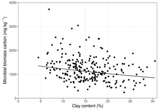 The relationship of MBC to soil physical and biogeochemical properties is somewhat variable. Although MBC typically increases in tandem with SOC [10,11], an increase in MBC in response to higher soil pH might or might not occur [12]. With regards to the response of MBC to increasing clay content, some studies have found a positive [13,14] and others have found a negative relationship [15,16]. Explanations for these opposing outcomes relate to the greater quantity of finer pore spaces in soils with higher clay content. When MBC is high, fine pores protect the microbes from animal grazers [13]; yet, when MBC is low, fine pores protect SOC from the microbes [15].