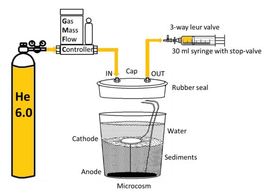 The CW-MES reactors were sampled once a week for N2O. For gas sampling, the vessel of the CW-MES reactor was closed tightly with the rubber seal and plastic cap, where the latter had connections for carrier gas inlet and gas sampling (Figure 1). Helium 6.0 was used to purged to the headspace of the vessel. The silicon tubes were evacuated with syringe before sampling. Gas samples from the headspace of the vessel were collected into a previously evacuated (0.3 mbar) 30 mL glass vial in every 40 min during a 2-h session (sample time-points: 0, 40, 80, and 120 min) using a polypropylene syringe. The N2O concentration from the samples was analyzed using Shimadzu GC-2014 gas chromatography equipped with an electron capture detector (ECD) and Loftfield’s autosampler [29].