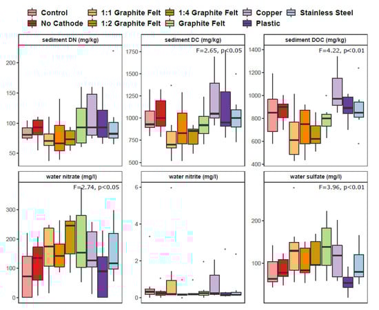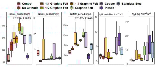 The water parameters for inorganic substrates, i.e., nitrate, nitrite and sulfate were also analyzed over the course of the experiment, nitrate and sulfate showed significant differences between treatments (p < 0.05 in both cases) (Figure 3). The trend in nitrate, nitrite, and sulfate concentrations remains similar during the sediment sampling days and throughout the experiment. No statistical differences were discernible in N2O emission values directly before soil sampling between treatments (p > 0.05) (Figure 3). The N2O emissions throughout the experimental duration displayed highest emissions for the treatments with cathodes 1:1 graphite felt, copper, plastic, and stainless steel.