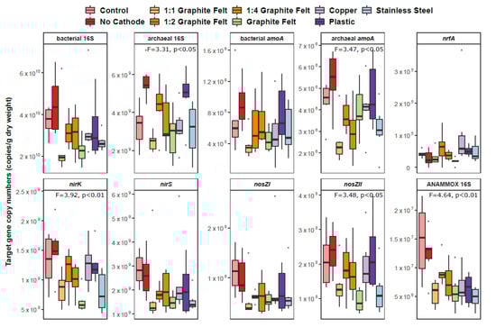 Box plots of target gene copy numbers in nine studied treatments (each n = 6). Statistically significant differences between groups considering different genes are shown with F and p values determined by multivariate analysis. The central line is the median, the edges of the box are the 25th and 75th percentiles, the whiskers represent the 95% confidence interval, and grey dots indicate outliers.