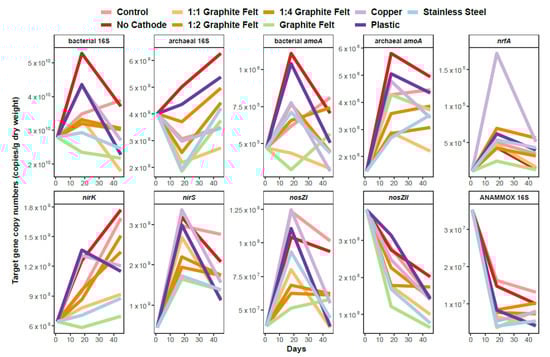 In addition, we can notice that the genes in the controls, i.e., control with no electrodes, no cathode control with just the anode electrode, and plastic as the cathode material, i.e., non-conductive electrode, displayed the highest number of abundances for many of the target N transformation genes. The fall in the target gene copy numbers in some other treatments can be attributed to the electrons passing through the system hampering the count of the microbes, thereby reducing the observed copy numbers in the conductive systems. Furthermore, the larger the size of the electrodes more is the conductivity and the reduction rate but when bio-electrochemical systems come into picture the major catalysts are the microbes and therefore, they should not burn out due to higher current through the systems. For example, some versions of graphite felt cathodes treatment (1:1 graphite felt and the systems in which graphite felt was used as a cathode material) lessen the abundances of bacteria, archaea as well as functional genes (especially denitrification genes) compared to other treatments, but this tendency was not seen in the target gene proportions of the prokaryotic community.