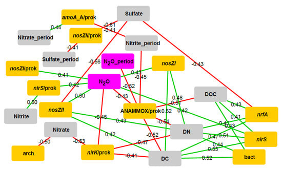 The Benjamini-Hochberg corrected Spearman correlation network (p < 0.05) for each target gene parameter and environmental factor pair (n = 42). Green is used to represent positive relationships, and red indicates negative relationships (exact R values are shown on the graph); yellow stands for gene abundances, grey for soil physicochemical variables and pink for gaseous parameters. Abbreviations: DN–dissolved nitrogen, DC–dissolved carbon, DOC–dissolved organic carbon, period–average values throughout the experiment, bact–bacterial 16S rRNA gene abundance, arch–archaeal 16S rRNA gene abundance, prok–prokaryotic community (total bacterial and archaeal 16S rRNA gene proportion), amoA_A–archaeal amoA gene abundance, ANAMMOX–anaerobic ammonia oxidation-specific 16S rRNA gene abundance, N2O–N2O emission.