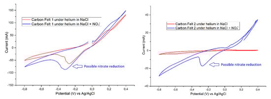 Different cyclic voltammograms of carbon felt (i.e., graphite felt) before and after Sodium Nitrate addition in the electrolyte under helium saturation. Possible nitrate reduction is showed by blue arrows.
