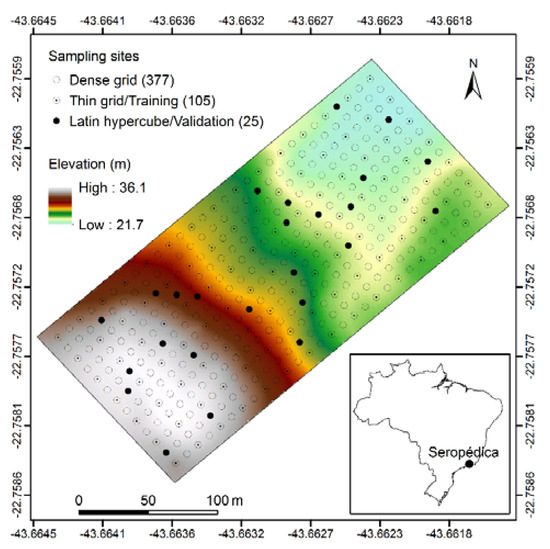 From the dense grid, a grid of 20 × 20 m (thin grid), with 15 by 7 points (105 points), was set by skipping every other sampling row and column (Figure 1). Additionally, 25 sampling sites for independent validation were distributed across the study area by conditioned Latin hypercube sampling (cLHS) [44], using the sampling row, sampling column, and elevation as strata. On these 130 sites, soil samples were collected at 0–10 cm and analyzed in the laboratory, according to Reference [45], for organic C (OC) content by wet oxidation with K2Cr2O7 + H2SO4, exchangeable bases (Ca and Mg extracted with KCl, and K and Na extracted with HCl + H2SO4), exchangeable acidity (H and Al extracted with Ca(C2H3O2)2), clay content by the hydrometer method, and soil θ and BD measured from 100-cm3 steel-ring samples. The sum of bases (SB) was derived as the sum of exchangeable bases, and the cation exchange capacity (CEC) as the sum of SB and exchangeable acidity.