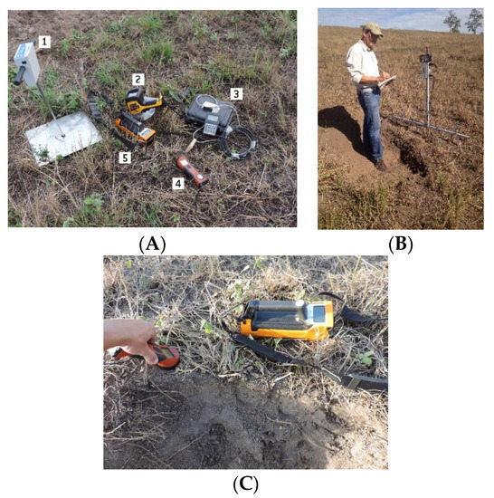 A sampling grid of 10 × 10 m (dense grid) was set inside the study area, with 29 points distributed along the toposequence by 13 points across (377 points), leaving a 10-m buffer outside the grid (Figure 1). Six proximal soil sensors (Figure 2) were used to take in situ measurements on these 377 sites. Apparent magnetic susceptibility (MSa) [36] was measured by the KT-10 S/C sensor (Terraplus Inc., Richmond Hill, ON, Canada; Figure 2A, sensor #4). Apparent electrical conductivity (ECa) [37] was measured at the surface by the KT-10 S/C sensor, and at 0–10, 0–20, and 0–40 cm by the Rabellis sensor (Embrapa Instrumentação Agropecuária, São Carlos, SP, Brazil; Figure 2B) [38]. The RS-230 BGO gamma-ray spectrometer (Radiation Solutions Inc., Mississauga, ON, Canada; Figure 2A, sensor #5) [39] was used to measure the dose rate and equivalent of U (eU) and Th (eTh) contents, with measurements taken over 120 s at the soil surface. The soil volumetric moisture (θ) was measured by the CS650 water content reflectometer (WCR) (Campbell Scientific Inc., Logan, UT, USA; Figure 2A, sensor #3) [40], and the cone penetration resistance (PR) by the PenetroLOG cone penetrometer (Falker Automação Agrícola Ltd.a., Porto Alegre, RS, Brazil; Figure 2A, sensor #1), using a type 2 cone, both at 0–10 cm. Finally, the DP-6000 pXRF sensor (Olympus Scientific Solutions Americas Inc., Waltham, MA, USA; Figure 2A, sensor #2) [41] was used in “Soil” mode to measure total element contents of various elements at the soil surface. The three beams were used for 30 s each, totaling 90 s per sample. Many element contents were below the sensor detection limits for many samples. Thus, only those element contents with at least 374 valid readings were selected for the study, including K, Ti, Mn, Fe, Zn, Rb, Sr, Zr, Ba, Cr, and Pb. In previous studies, this pXRF sensor achieved 72–90% recovery against NIST certified soils for Fe, 85–95% for Mn [42], and 90–109% for Ti [43].