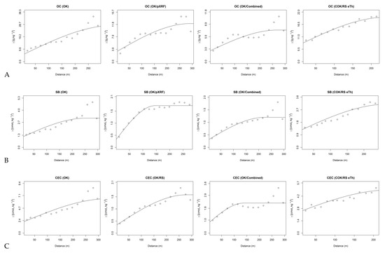 Among OK approaches, except for clay content, the nugget variance decreased when the dense grid sensor data was used, which makes sense because data is available to explain the variance over shorter distances. Most soil properties showed a marked increase in the empirical semivariance at around 200 m, which is related to the approximate distance between the hillslope positions with the most distinct soil properties values in the area. In detail, on the summit and shoulder, in the southwest of the area (Figure 1), Lixisols are present with higher OC, SB, CEC, and θ values, whereas on the footslope and floodplain, in the central-east part, Planosols with lower soil property values are found. This increase in the semivariance can indicate an uncorrected geographic trend, which is not desired for OK. Thus, universal kriging using the geographic coordinates and elevation to remove the trend was tested in a separate study, and did not show considerable differences in the spatial patterns and quality of output maps that supported its use instead of OK [55].