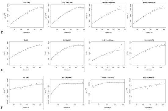 Empirical and fitted spherical variograms of soil (A) organic carbon content (OC; g kg−1), (B) sum of bases (SB; cmolc kg−1), (C) cation exchange capacity (CEC; cmolc kg−1), (D) clay content (g kg−1), (E) volumetric moisture (θ; %), and (F) bulk density (BD; g cm−3). OK, ordinary kriging; COK, ordinary cokriging; eTh, equivalent Th content; ECa, apparent electrical conductivity; pXRF, DP-6000 portable X-ray fluorescence spectrometer; RS, RS-230 BGO gamma-ray spectrometer; KT, KT-10 S/c MSa/ECa sensor.