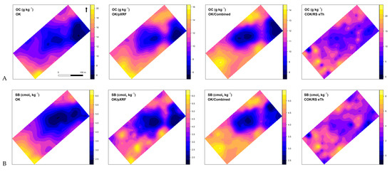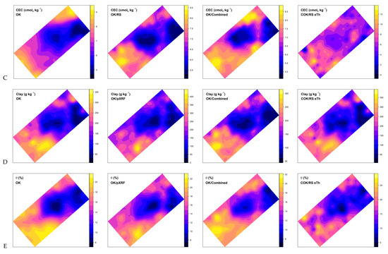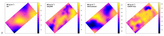 Maps of soil (A) organic carbon content (OC; g kg−1), (B) sum of bases (SB; cmolc kg−1), (C) cation exchange capacity (CEC; cmolc kg−1), (D) clay content (g kg−1), (E) volumetric moisture (θ; %), and (F) bulk density (BD; g cm−3). OK, ordinary kriging; COK, ordinary cokriging; eTh, equivalent Th content; ECa, apparent electrical conductivity; pXRF, DP-6000 portable X-ray fluorescence spectrometer; RS, RS-230 BGO gamma-ray spectrometer; KT, KT-10 S/c MSa/ECa sensor.