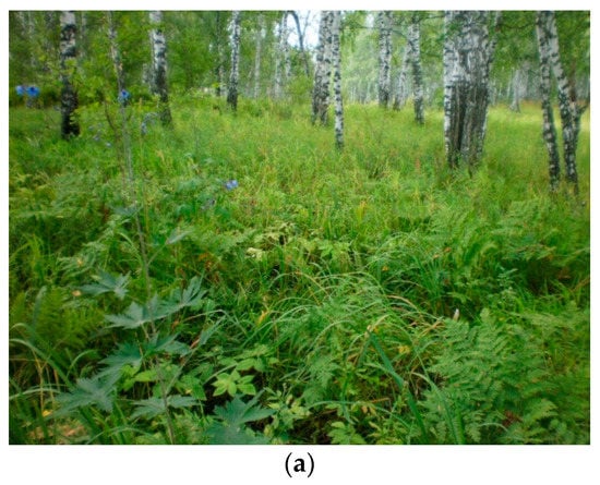 The study site is located in the forest-steppe zone in the south of West Siberia in the Novosibirsk region (55°00’ N, 83°04” E). The climate of the region is classified as sharply continental with average maximal temperatures in summer (June–August) ranging 22–26 °C and average precipitation ranging 40–65 mm per month, with 119 days of the frost-free period (https://meteoinfo.ru/en/climate/monthly-climate-means-for-towns-of-russia-temperature-and-precipitation, accessed on 24 February 2021). White birch (Betula pendula Roth.) is the main forest-forming tree species (Figure 1a), although some scarce Scots pine trees (Pinus sylvestris L.) are also present. Under the canopy of trees, the ground is covered by a rather rich assemblage of herbs and grasses, consisting of 49 species representing 27 families, such as Caryophyllaceae, Plantaginaceae, Polygonaceae, Hypericaceae, Primulaceae, Lamiaceae, Euphorbiaceae, Rosaceae, Lythraceae, Apiaceae–Ubelliferae, and others. Fabaceae and Asteraceae families were the most species-rich, each being represented by seven species. The soil (Figure 1b) is Grey soil, according to the national classification of Russian soils [6], or Grey-Luvic Phaeozem, according to the World Reference Base for soil classification [7].