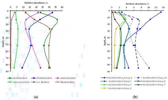 As for relative abundance, the dominance of Proteobacteria, Acidobacteria, and Actinobacteria phyla was much more pronounced as together they accounted for 77% of the total number of sequences in the top horizon, the percentage slightly decreasing downwards (Figure 2a). The relative abundance of bacterial sequence reads that could not be assigned below the domain level, increased with soil depth, accounting in the subsoil horizons for 30% of the total number of sequences.