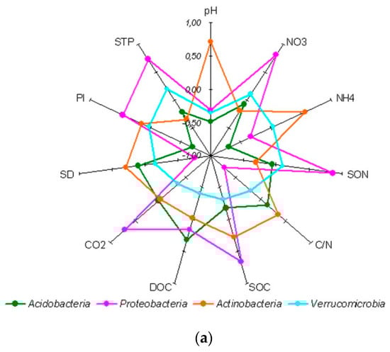 Spearman’s correlation coefficients of taxa relative abundance with some soil properties showed specific patterns (Figure 3). The major dominant phylum Acidobacteria showed no correlation with soil macronutrient content, correlating negatively with extractable ammonium and labile phosphorus (Figure 3a). The relative abundance of Proteobacteria displayed a high positive correlation with soil SOC, SON, STP, basal respiration, and nitrate content, correlating negatively with soil bulk density and C/N ratio of soil organic matter. Actinobacteria displayed a positive correlation with soil pH and extractable ammonium, whereas Verrucomicrobia showed no statistically significant relationship with the studied soil properties.