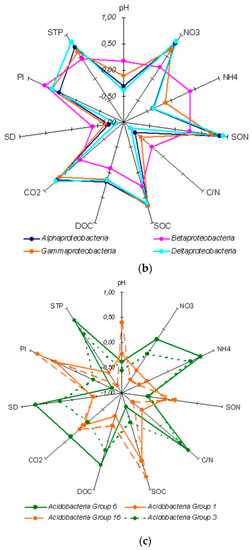 At the class level, all four classes of Proteobacteria phylum, detected in the study, had the same correlation pattern with soil properties (Figure 3b), while Acidobacteria classes showed at least two different correlation patterns (Figure 3c). The dominant Acidobacteria group 6 correlated positively with SOC, SON, extractable p and mineral N, and soil basal respiration, and negatively with soil density and C/N ratio of soil organic matter. The other dominant acidobacterial classes, i.e., Acidobacteria group 1 and Acidobacteria group 16, showing a positive correlation with soil density and C/N ratio, revealed their preference for plant matter that is recalcitrant for decomposition and occurs at lower depths in a soil profile.