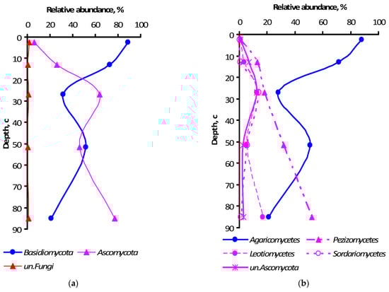 Relative abundance of fungal phylum (a) and class (b) specific ITS amplicon sequences in genetic horizons of the undisturbed Grey-Luvic Phaeozem under birch forest in the south of West Siberia. The markers show the means of three individual soil samples.