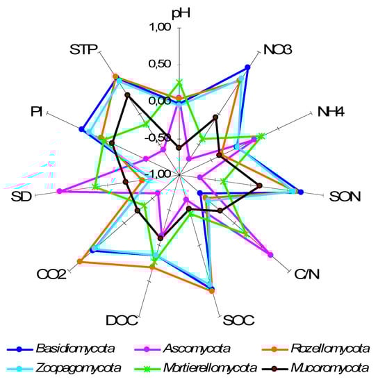 Correlation coefficients (Spearman’s) between soil properties and relative abundance of some fungal phyla. The coefficients exceeding │0.51│are statistically significant at p ≤ 0.05 level. Abbreviations used: SOC—soil organic carbon content, DOC—dissolved organic carbon content, SON—soil organic nitrogen content, STP—soil total phosphorus content, Pl—labile soil phosphorus content, C/N—soil organic matter C/N ratio, CO2—soil basal respiration, SD—soil bulk density.