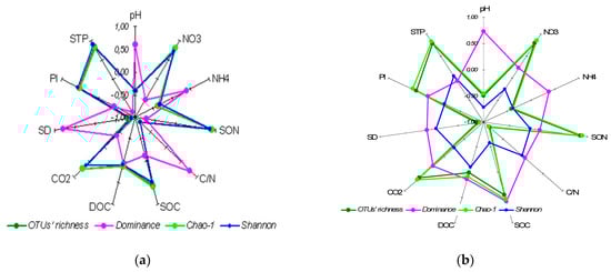 Correlation coefficients (Spearman’s) between soil properties and bacterial (a) and fungal (b) α-biodiversity indices. The coefficients exceeding │0.51│are statistically significant at p ≤ 0.05 level. Abbreviations used for soil properties: SOC—soil organic carbon content, DOC—dissolved organic carbon content, SON—soil organic nitrogen content, STP—soil total phosphorus content, Pl—labile soil phosphorus content, C/N—soil organic matter C/N ratio, CO2—soil basal respiration, SD—soil bulk density.