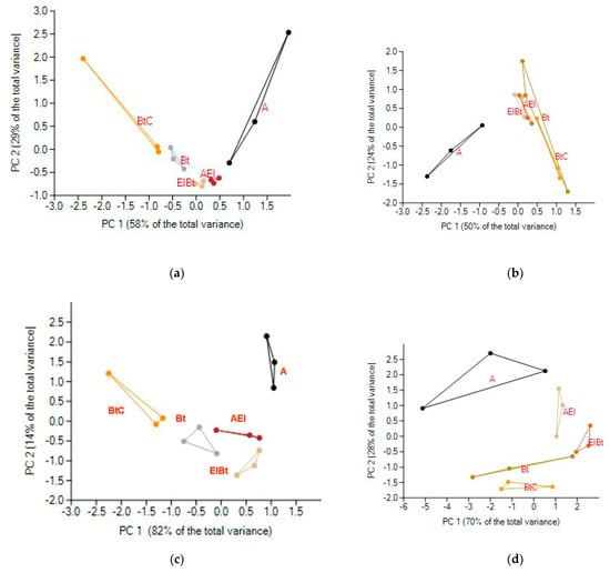 The principal component analysis showed clear separation of the A genetic horizon from the subsoil horizons; the separation being more prominent in the case of Fungi (Figure 7b,d). Notably, when α-diversity indices were used for PCA, PC1, accounting for 82% for bacteria, was determined by the profile gradient, whereas for fungi, PC1 seemed to be determined by the sample replicates, whereas the downward profile gradient defined PC2, which accounted for 25% of the data total variance.