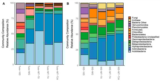 Microbial community composition within (A) tussock tundra and (B) wet sedge tundra soils based on the mean relative abundance of 16S rRNA amplicons, GPM-normalized metagenome (MG), and TPM-normalized metatranscriptome (MT) genes belonging to Ribosome KEGG tier III pathway.