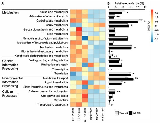 Heatmap (A) and barplot (B) of genomic potential based on the mean relative abundance of GPM-normalized metagenome (MG) genes belonging to KEGG tier III functional pathways by sampling time point in mesocosm replicates of tussock tundra and wet sedge tundra communities. Z-score transformations based on the mean relative abundance of genes between sampling time points for each KEGG pathway. Error bars for each barplot represent standard deviation from the mean. Asterisks mark the significance of differences in mean relative gene abundance between tundra communities for each KEGG tier III pathway (paired t-test; ** p < 0.01; * p < 0.05).