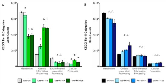 Barplot of microbial gene expression based on the mean relative abundance of TPM-normalized metatranscriptome (MT) genes annotated as KEGG tier II functional pathways by sampling time point in (A) tussock tundra and (B) wet sedge tundra communities (error bars represent standard deviation of the mean). Letters indicate significant differences in mean pairwise similarity between sampling time points for each KEGG functional pathway (ANOVA; p < 0.05), with non-significant differences among sampling time points indicated as N.S. The relative abundance of GPM-normalized metagenome (MG) functional genes is provided for reference only and their abundance was not incorporated in the pairwise statistical analysis.