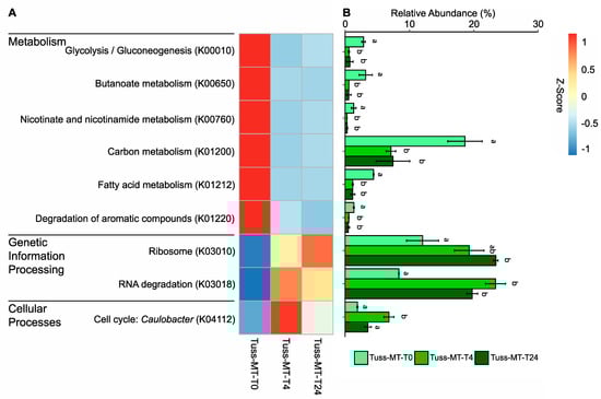 The change in microbial gene expression in response to rainfall was determined using the relative abundance of TPM-normalized metatranscriptomes annotated at KEGG tiers II-IV. Within the tussock tundra community, the relative abundance of expressed functional genes annotated to the KEGG tier II category of Metabolism was significantly greater at T0 relative to the abundance of expressed genes at T4 and T24 (ANOVA; p < 0.01 for both; Figure 3A). Following simulated rainfall, the relative abundance of expressed genes at T4 and T24 was significantly greater for the KEGG tier II category of Genetic Information Processing relative to T0 (ANOVA; p < 0.01 for both; Figure 3A). The relative abundance of expressed genes for the KEGG tier II category of Cellular Processes was also significantly greater at T4 relative to T0 (ANOVA; p < 0.01; Figure 3A) but was not significantly different at T24 relative to T0 (ANOVA; p = 0.1; Figure 3A).