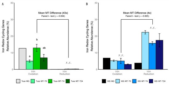 Barplot of iron redox cycling gene expression based on the mean relative abundance of iron oxidation and iron reduction genes at each sampling time point in (A) tussock tundra and (B) wet sedge tundra communities (error bars represent standard deviation of the mean). Letters indicate significant differences in mean pairwise similarity between sampling time points in each iron redox cycling functional category (ANOVA; p < 0.05), with non-significant differences between sampling time points indicated as N.S. The relative abundance of each metagenome (MG) iron redox cycling functional category is provided for reference only and was not incorporated in the pairwise analysis.