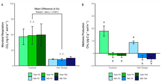 Barplot of production rates for (A) microbial respiration and (B) methane (CH4) production for tussock tundra and wet sedge tundra communities (error bars represent standard deviation of the mean). Letters indicate significant differences in mean pairwise similarity between sampling time points (ANOVA, p < 0.05), with non-significant differences between sampling time points indicated as N.S. Negative values for CH4 production indicate CH4 consumption.
