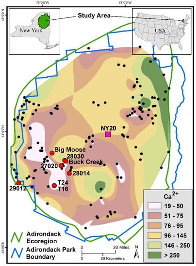 The ranges in Ca2+ availability presented in Figure 1 relate to general geochemical and ecological relationships and are roughly based on soil conditions and acidic deposition levels for 2018, the year stream samples were collected. The range of extremely low Ca availability corresponds to minimal acid buffering; therefore, Adirondack streams with Ca2+ concentrations lower than 50 µeq L−1 are likely to experience periods of acidification that produce harmful Al concentrations [31]. Concentrations of Ca2+ lower than 75 µeq L−1 provide insufficient nutrition for the survival of key species in aquatic food webs [30], as well as low acid-buffering capacity. Concentrations of Ca2+ between 75 and 95 µeq L−1 provide marginal acid buffering. Concentrations of Ca2+ above 95 µeq L−1 are likely to provide sufficient acid buffering to avoid harmful acidification during most flow conditions. Streams with Ca2+ concentrations above 145 µeq L−1 can be considered well buffered, and streams with Ca2+ concentrations above 250 µeq L−1 can be considered extremely well buffered. These categories of Ca2+ concentrations in headwater streams indicate that even with the current low levels of acidic deposition, nearly half of the Adirondack region is experiencing impairment from low Ca availability. Figure 1 also indicates that a large portion of the western Adirondack region is still subject to severe acidification, with questionable ability for recovery.