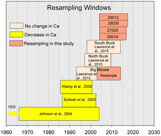 The study presented here builds upon previous studies of soil monitoring in the Adirondack region that documented widespread decreases in soil Ca with sampling up to the early 2000s (Figure 2). One study that linked sampling in the 1930s to resampling in 1984 and 2004 documented depletion of Oa horizon Ca throughout much of the Adirondack region [18]. Two additional studies that compared exchangeable Ca concentrations across the Adirondack region in the mid-1980s to measurements in the early 2000s found decreases in Ca in either the Oa [20] or upper B horizon [41]. Additional Adirondack studies for individual watersheds (Figure 2) showed no changes in exchangeable Ca concentrations in either the Oa or upper B horizon in the Big Moose watershed for the period 1992–1993 to 2003 [42], the North Buck watershed from 1997 to 2009–2010 or the South Buck watershed from 1998 to 2014 [28].