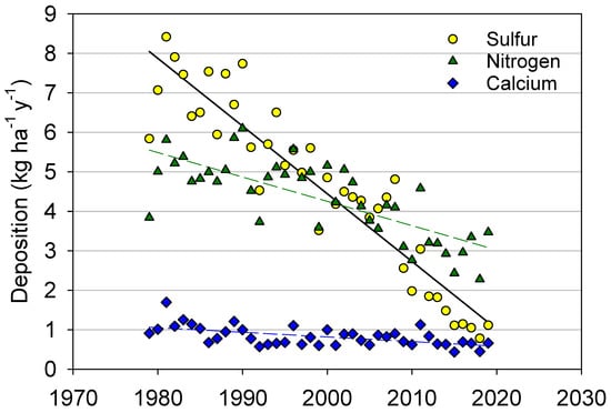 Annual values of total atmospheric wet deposition of sulfur, inorganic nitrogen (sum of NO3− and NH4+) and calcium at the National Atmospheric Deposition Program monitoring site NY20. The solid black line represents the best linear fit of the sulfur trend; the dashed green line represents the best linear fit of the nitrogen trend; the dashed blue line represents the best linear fit of the calcium trend.