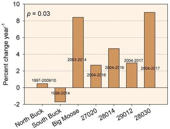 The most recent study across eastern North America suggested that Ca depletion in the upper B horizon has slowed or perhaps stopped, but these data do not extend past 2010, with the exception of one watershed in 2014 [28]. Although none of the individual watersheds in the study presented here showed statistically significant increases in Ca, the significant increase in Ca for the watersheds as a whole (Figure 4) suggests the possibility that Ca availability may have begun to improve in the upper B horizon in the western Adirondack region, which also tends to have the lowest Ca2+ concentrations in stream water. The base saturation results in the B horizon may also suggest signs of recovery, despite movement of Al out of the forest floor as organic horizons recover. However, base saturation responses are less consistent among watersheds. North and South Buck showed decreases in base saturation, but these watersheds had the earliest sampling window. Of the remaining five watersheds, one showed a significant increase and none showed significant decreases in base saturation. Interpretation of base saturation responses is complicated by significant increases in Al that were quite large in North and South Buck and Big Moose. These increases could reflect the movement of Al out of the Oa horizon that is being deposited in the upper B horizon under conditions of reduced Al mobility. However, ongoing mobilization of inorganic Al by strong inorganic acids could have a similar effect on B horizon base saturation. Continued inorganic anion leaching from mineralization of S and N was identified through 2015 as an ongoing problem in North and South Buck, although the effect has been decreasing [31].