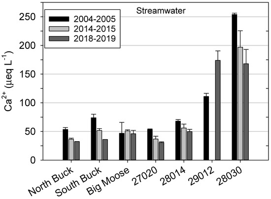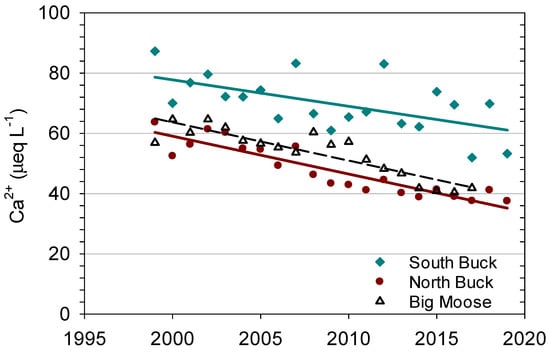 In continuously monitored streams, annual mean concentrations of Ca2+ decreased by approximately 20 percent and 30 percent in South and North Buck, respectively, from 1999 to 2019 (Figure 5). The slope and R2 of South Buck equaled −0.88 µeq y−1 and 0.35, respectively, and the slope and R2 of North Buck equaled −1.26 µeq y−1 and 0.83, respectively. Annual mean concentrations of Ca2+ for the outlet stream of West Pond showed concentrations and a rate of decrease highly similar to those measured in North Buck (Figure 5) with a slope and R2 of −1.31 µeq y−1 and 0.84, respectively. The trends in each of these streams were approximately linear and were significant at p < 0.01. Although the North and South Buck watersheds lie in close proximity, Ca2+ concentrations at North Buck were consistently lower than at South Buck, and the difference in stream concentrations between the watersheds increased somewhat over the 20 years.