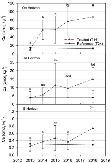 As expected, increases in Oe horizon Ca were apparent after one year (p < 0.01) in the treated watershed, but values did not change in the second year (Figure 7). However, further increases (p < 0.01) in Ca relative to the pretreatment year were observed after 3 years and 5 years (Figure 7). The linear regression indicated an increase in Ca over the 5 years in the Oa horizon of the treated watershed (p = 0.02), but a significant change relative to pretreatment was not recorded until the end of the third year (p = 0.04), and then after 5 years (p < 0.01). In the B horizon, the linear regression also indicated an increase in Ca over the 5 years in the treated watershed (Figure 7). However, only the fifth year was significantly higher (p < 0.01) than the pretreatment year. Although a significant increase was not recorded until the fifth year, the Ca concentration in the fifth year was approximately three times that of the pretreatment year.