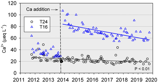 Concentrations of Ca2+ in stream water prior to the October 2013 treatment were somewhat higher in the watershed to be treated (T16) than in the reference watershed (T24) during this period (Figure 8). The Ca addition on 1–4 October 2013 immediately increased Ca2+ concentrations in the stream of the treated watershed from approximately 30 µeq L−1 to over 550 µeq L−1, but by October 30, concentrations had decreased to 121 µeq L−1. Concentrations continued to decrease nonlinearly through 2014–2016, reaching an apparent asymptote of approximately 70 µeq L−1 from 2017 to 2019. Although concentrations in the last 3 years plateaued, month-to-month variation increased. Over the full study period, Ca2+ concentrations in the stream of the reference watershed decreased linearly (p < 0.01) from approximately 25 to 20 µeq L−1, although a consistent seasonal pattern existed throughout the record (Figure 8). The Ca2+ values of the two watersheds prior to treatment fell in the lowest category of Ca availability in the Adirondack region (Figure 1).
