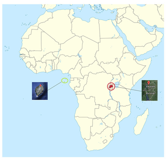 Location of the Vitric Andosol (São Tomé) and the Silandic Andosol (Rwanda).