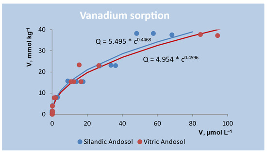 The fit to the Freundlich model suggests that the adsorption energy decreases exponentially as the concentration in the adsorbed phase increases. As the amount of adsorbed ions increases, the affinity of the adsorbent surfaces for these ions decreases, since the higher-energy adsorption sites are increasingly occupied; the adsorption energy is progressively lower, varying exponentially with the concentration in the adsorbed phase. As in the present study, V adsorption by 30 German soils [68] and 25 European mineral soils [26] fitted to the Freundlich model. The constant KF, slightly higher in the Silandic Andosol (5.495 vs. 4.954), is related by some authors to the sorption capacity, but, according to Russell and Prescott [70], it is related to the retention force of the adsorbate by the adsorbent. The constant m, related to the accessibility of the sorbing surfaces [71], was very similar in both soils (0.4596 and 0.4468), indicating a rather high heterogeneity of the sorbing surfaces [67].