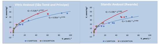 V sorption and desorption isotherms (sorbed V (mmol kg−1) vs. V concentration in the equilibrium solution (µmol L−1)) fitted to the Freundlich model.