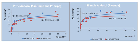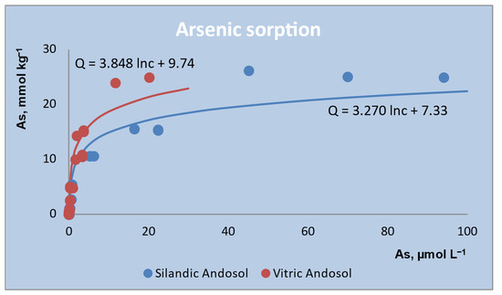 Sorption/desorption processes control the As concentration in the soil solution and the risk of exportation to vegetation and water bodies [78,80,81]. Both soils studied, particularly the Vitric Andosol, can effectively protect other environmental compartments against arsenic contamination.