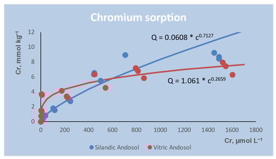 Cr sorption isotherms (sorbed Cr (mmol kg−1) vs. Cr concentration in the equilibrium solution (µmol L−1)) fitted to the Freundlich model.
