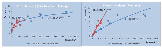The chromate sorption was relatively low (between 19 and 97% of the added amount in the Vitric Andosol and between 23 and 56% in Silandic Andosol, Table 2). The sorbed Cr reached 8.8 mmol Cr kg−1 in the Silandic Andosol (Rwanda) and 7.2 mmol Cr kg−1 in the Vitric Andosol (São Tomé) for a Cr concentration of 1.9 mmol L−1 (100 mg L−1) in the equilibrating solution. Chromate was more sorbed by the Vitric Andosol in the low concentration range, while at high concentrations, it was the Silandic Andosol that sorbed more (Figure 6).