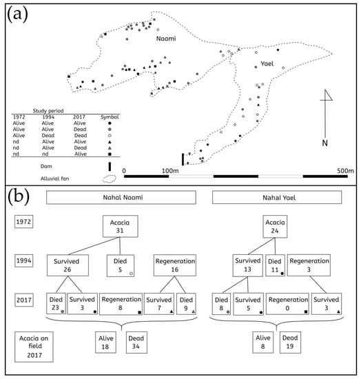 - Bendavid-Novak, H.; Schick, A.P. The response of Acacia tree populations on small alluvial fans to changes in the hydrological regime: Southern Negev Desert, Israel. Catena 1997, 29, 341–351. [Google Scholar] [CrossRef]