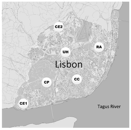 The characteristics of each location are: CE1—City Entrance in Belém (GPS: 38.69562, –9.19930)—one of the city entrances with an open topology and characterized by a high traffic intensity as well as a high population density; CE2—City Entrance in Calçada de Carriche (38.72653, –9.14992)—another city entrance, with a valley topology and a steep slope of entrance in the city. It is also characterized by a high traffic intensity and a high population density; UH—Urban Highway of Segunda Circular (38.75796, –9.16339)–a city circular road with urban highway characteristics. Moreover, it is characterized by an open topology and a very high traffic intensity; CC—City Center at Marquês de Pombal (38.78163, –9.16551)—it has a valley topology and is a high traffic, as well as a high population density site; RA—Residential Area (38.75741, –9.11784)—in the neighborhood of Olivais with open topology and a low traffic intensity; CP—City Park of Monsanto (38.73387, –9.17786)—a small sloping mountain and the major city green park. It has a low traffic intensity and no residential population or buildings.
