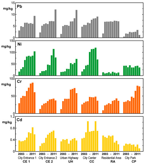 Different anthropogenic sources, just like industry, energy production and fossil fuels combustion in vehicle traffic, release to the atmosphere pollutants containing heavy metals that can contribute to the contamination of soils by dry or wet deposition [6,7]. Heavy metals, such as Pb, Zn, Cr, Ni or Cd, are the most frequently studied inorganic contaminants in urban soils and can be linked to adverse health hazard effects [8,9,10] since they cannot be decomposed by micro-organisms having a long-term toxicity for plants, animals and humans. High concentrations of heavy metals have been identified in many studies of urban soils, especially Pb [11] due to the use of leaded petrol [12,13]. With regulations like the one banning leaded petrol [14], emissions from single vehicles have been reduced, although this effect could be compensated by the worldwide increasing road traffic [15,16]. Emissions resulting from vehicle traffic are mostly caused by wear of vehicular components like break lining, tire wear off and exhaust, as well as from incomplete fuel combustion, fuel additives or oil leaking from vehicles [17].