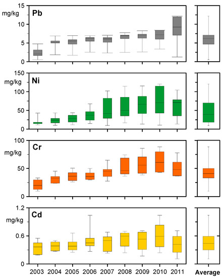 Metal content (Pb, Ni, Cr and Cd) in each sampled site over the years of the campaign (2003–2011).