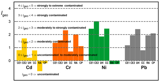 Results of Igeo calculated values are presented in Figure 4. Ni shows the highest values followed by Cr and Pb. Ni exhibits moderate levels of contamination at all sites except in residential area (RA) and the city park (CP), both classified as “uncontaminated”. Higher values of Igeo for Ni were found in the soils next to the city entrance 2 (CE2). For Pb and Cr the Igeo index have classifications between “uncontaminated” and “moderately contaminated”. Regarding the values of Igeo for Cd, this metal reveals an “uncontaminated” contamination class in UH, RA and CP and an “uncontaminated to moderately” class in the city entrances (CE1, CE2) and at the city center (CC).