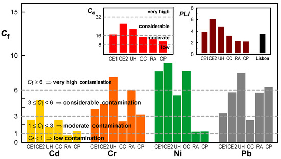 Considering the calculated index, soils can be classified according to the contamination levels proposed by Hakanson [23] from “low contamination” (Cf < 1) to “very high contamination” (Cf ≥ 6).