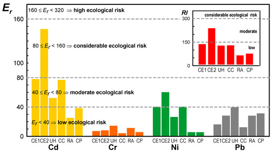 The calculated values for the ecological risk factor (Er) and global potential ecological risk (RI) are shown in Figure 6.